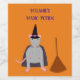 This awesome sheet of wine bottle labels features a digital art image of a cute grey rat witch with pink ears, nose, feet and tail. The rat is wearing a black pointed hat with a gold buckle and purple stars all over it. The rats is also wearing a black cloak also covered in purple stars. Next to the rat is a brown broom made of twigs. This rat is dressed up ready for a Halloween party. There is custom text so you can include a message.