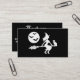 Small business thank you for your order card design featuring Destei's minimalist Halloween silhouette design of a long hair witch woman flying on a broomstick. The witch is wearing a long dress, high heel shoes and a witch's hat. The moon is shining behind the witch and there are three bats flying over it. A cat sits on the front of the broomstick. On the other side there are multiple personalizable text areas.