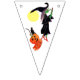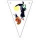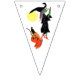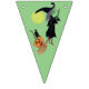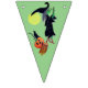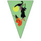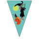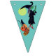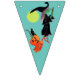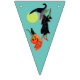 Bunting flag with a Halloween witch riding her broom. She has a couple of passengers on her broom. A jack - o - lantern and black cat have hitched a ride. There is a full moon behind them. The background colours alternate from white to teal to green. The perfect addition to your Halloween party.