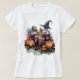Halloween Witchy Tee Apothecary Watercolor shows bottles, potions, pumpkins, witches hat, in fall watercolor colours
