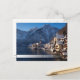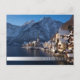 Photo postcard of the town of Hallstatt covered in snow at the lakeside of the Hallstätter See lake with Alps mountains in the background in the first light of the sunrise in a winter landscape in Austria with a fading white bar and the text 'Hallstatt'.
