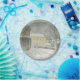 This design features a painting by the British artist Eric Ravilious (1903–1942). It depicts a local road in rural England during a snowy winter. There is a grand house painted yellow in the middle of the scene. There are some smaller houses towards the right. The trees are bare; the leaves have already fallen from their branches. Snow is falling from the sky, and the ground is white with snow that has already fallen. There are some tyre marks on the road where cars or bicycles have ridden through the snow. The original artwork was painted by Eric Ravilious in 1935.