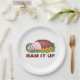Plates feature an original marker illustration of a glazed sliced holiday ham on a platter with pineapples, and HAM IT UP in a fun font. Ideal for Christmas celebrations. Matching napkins available!