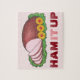 Puzzle présente une illustration originale d'un jambon de vacances émaillé sur un plateau avec ananas, imprimé sur un arrière - plan rose pâle. HAM IT UP est imprimé en dessous dans une police marrante bordeaux et rose. Parfait comme un rembourrage ou un cadeau de vacances amusant!