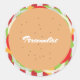 Features a hamburger with all the trimmings on a red and white striped background. Personalize if you wish.