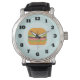 A watch with an illustration of a simple hamburger. Lettuce tomato and beef patty. Simple and delicious.