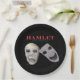 For theatre buffs. Shakespeare’s Hamlet shows title in bright red and underneath are comedy masks. Behind one mask are grinning teeth and a single blue eye.