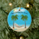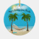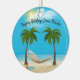 Hammock hanging between two palm trees with starfish, cocktail drink, and flip-flops on ocean beach sand with clouds.