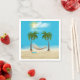 Hammock hanging between two palm trees with starfish, cocktail drink, and flip-flops on ocean beach sand with summer clouds.