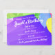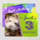 It's your birthday hamster invite card. Design with a furry white and brown hamster. The background is a colourful bright purple geometric design. The back is decorated with colourful balloons floating up to the sky over blue geometric shapes. Here, you can also put in detail information about the party: name, location, date, time, etc.