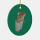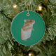 A green Christmas ornament featuring a painted hamster illustration.