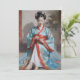 A woman wearing traditional East Asian attire sits gracefully, with her eyes downcast and hands gently holding the fabric of her robe. The intricate patterns and bright colours of her garment stand out against a softly blurred background that includes floral details.