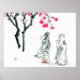 Two young ladies enjoying the transient beauty of flowers of sakura trees painted in sumie technique with sumi ink and watercolors on rice paper.
