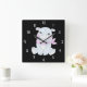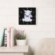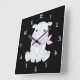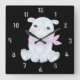 This wall clock displays the body of Hancy The Hippo a baby hippo in the centre wearing a pink bandana with pink cheeks in a sitting pose inside of light blue numbers with black background in this animal theme & style. This clock is made for any wall and printed with a AcryliPrint®HD process measures 10.75"x10.75" and made from grade-A acrylic. Battery operated uses one AA battery for Indoor use only, not recommended for outdoor use.