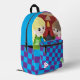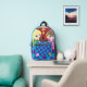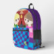 A backpack with a checked pattern featuring hand drawn art of Samantha and Stacey going to school and a small Beary and Ellie on the front bag all characters from the books of "The Underground Toy Society". The perfect backpack to add to your child's back to school products!