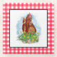A chicken sitting in clover and flowers hand drawn sketch. Cute gift for your favourite chicken mom. Yellow and red chequered gingham back.