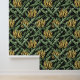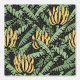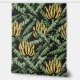 This exotic large-scale wallpaper features hand drawn yellow banana bunches and leaves in black ink, with cross-hatch detailing, all against an elegant almost black background. The background features a subtle pattern of raindrops in a lighter shade. Pattern size is 24" by 24"