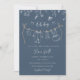 This is a minimalist baby shower invitation card, featuring baby clothes and a teddy bear hanging on a clothesline, decorated with delicate floral illustrations at the top, on a dark blue background. The text "Oh boy" is elegantly written. All elements are hand drawn.