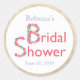 This bridal shower round sticker features a white background accented with a rustic "old paper" border and dark pink and light purple hand drawn flowers for the letter "B" and the letter "S" in the words: Bridal Shower. Customizable text allows for the name of the bride-to-be and the shower date.