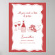 A unique, hand drawn design featuring illustrations of traditional Italian wine and pizza. A beautiful red and white bridal shower design with an Italian Pizza and wine theme. Customize this pizza and wine themed bridal shower design and make it your own!