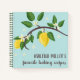 Recipe notebook with a hand-drawn lemon branch with leaves, fruits, and lemon flowers on the cover. Add your name in a brown calligraphy font.