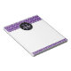 This notepad features a trendy hand drawn swirl pattern in white on a purple background. A black circle at the top offers a customizable monogram and name.
