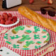 A pattern of various different types of cacti planted in different colours of pots. They are placed on a light pink background and are surrounded with cactus needle shapes. Each cactus is coloured with watercolours in bright green shades!