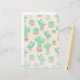 A pattern of various different types of cacti planted in different colours of pots. They are placed on a light pink background and are surrounded with cactus needle shapes. Each cactus is coloured with watercolours in bright green shades!