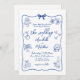 Quirky Hand-Drawn Whimsical Wedding Invitation. This artistic and playful design is perfect for couples looking to infuse their big day with a creative, lighthearted vibe. Now styled in a sleek blue and white palette, it has a hand-drawn charm that is both modern and timeless. A swirling, wavy frame adorned with a simple bow highlights your wedding details, presented in a mix of elegant script and handwritten-style fonts for a relaxed yet sophisticated look.
