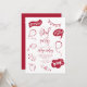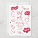 Funky graduation party invitation card featuring hand drawn illustration of graduation and school related icons in red.
