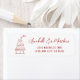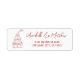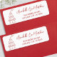 This elegant return address label features a simple champagne tower illustration on the left side, accented with soft red tones. Your name is written in a graceful red handwritten script, while the address appears in a classic red serif font on the right. The design has a chic and celebratory feel, perfect for wedding invitations, bridal shower thank you notes, engagement parties, or any special event.