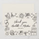 This playful and heartfelt thank you card now features an ivory or off-white background with black fonts and artwork for a classic, timeless look. The front showcases charming hand-drawn illustrations—champagne towers, disco balls, cameras, wedding bells, hearts, and more—surrounding the center where "Thank You" appears in a handwritten-style font. Below, the couple's names and wedding date are displayed, creating a sweet and personal keepsake.