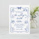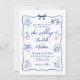 This whimsical blue and white wedding invitation is perfect for couples looking to add a touch of European charm to their celebration. Inspired by the elegance of French and Italian design, the hand-drawn illustrations in this playful, artistic invitation bring a relaxed yet sophisticated vibe to your big day. A swirling, wavy blue frame with a dainty bow draws attention to your wedding details, presented in a mix of elegant script and handwritten-style fonts.