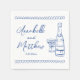 Personalized Hand Drawn Champagne Whimsical Wedding Napkins. This elegant and minimalist wedding cocktail napkin features a charming hand drawn illustration of a champagne bottle and glass, perfect for celebrating your special occasion. In soft blue and white tones, the bride and groom's names and wedding date are elegantly displayed beneath the artwork in a mix of handwritten script and simple fonts, creating a stylish yet approachable vibe.