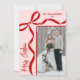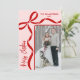 Send holiday cheer with this vertical Christmas card featuring a modern, slightly off-center layout. The photo sits in the bottom right corner, extending off the edge for a fun, contemporary look. A hand-drawn coquette bow rests in the top left, with ribbon lines running along the top and down the left side of the image, all in red for a bold festive touch. “Merry Christmas” appears vertically along the bottom left side in matching red script. Your family name and date sit in the top right in coordinating red serif text, keeping everything clean and balanced.