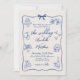 This whimsical wedding invitation, now featuring a vintage off-white or aged parchment background, is perfect for couples seeking a touch of European charm for their celebration. Inspired by the timeless elegance of French and Italian design, the hand-drawn illustrations in this artistic invitation create a relaxed yet sophisticated vibe. A swirling, wavy frame in soft blue, accented with a dainty bow, highlights your wedding details, beautifully displayed in a mix of elegant script and handwritten-style fonts.