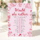 Add a fun and interactive activity to your celebration with this Pink Hand Drawn “Would She Rather?” Bridal Shower Game. Designed in a charming hand-drawn style with soft pink accents and playful doodle details, this game is perfect for bridal showers, bachelorette brunches, Galentine’s parties, or romantic Valentine-inspired celebrations.