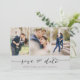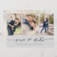 Pick the best pictures from your engagement shoot or your favorite pictures of the two of you for this perfect save the date. The words save the date are handwritten to give a personal feel to the card. The front has 3 images and the back has a large image with a white filter on top. Edit this save the date wedding card with your information and customize it for further for font and font color options.