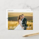 Hand-lettered white script overlay design photo wedding saves the date announcement card - horizontal. Send out your save-the-date cards as a newly engaged couple to your friends and family using this beautifully, simply save-the-date postcard with a white handwriting script text overlay design. Design by Be Handsome. Replace the sample photo with your own. Add your personal information on the front and on the back.