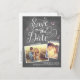 Whimsical and stylish save the date 2-photo announcement postcard featuring modern calligraphy script on a chalkboard background with photo snapshots.