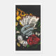 Original vector art of a hand holding playing cards that are on fire. With gold coins, dice, 8 Ball, Ribbon and a rose.