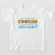 Never get between a kid and their cookies, or you will reap the consequences. This shirt features a kid's clear demands, with big, bold type and obviously distraught cookie illustrations.