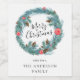 Elegant, holiday wine labels featuring "Merry Christmas" in a modern calligraphy script encircled by a watercolor wreath of pine branches, pinecones, and red Christmas ornaments. Personalize the festive holiday wine labels by adding a custom greeting and your name.