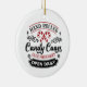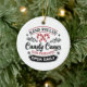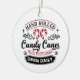 This farmhouse style ornament features a logo style design that says "Hand rolled Candy Canes." Colours include red and black.
