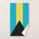 Crafted with meticulous attention to detail, this hand towel celebrates the vibrant spirit of the Bahamas. The design proudly showcases the iconic aquamarine and gold stripes with a black triangle and white stripes, symbolizing the nation's tropical beauty and maritime heritage.