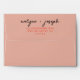 A retro modern hand written bright colourful wedding envelope. Which features calligraphy hand lettered bride and groom's names inblack colour. And personalized orange return address . On simple peach peachy trendy vintage colour background. Which suits the whole wedding suite.