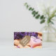 A business card featuring a heart shaped soap bar and lavender flowers with an optional label on the front. Beautiful for anyone who sells handmade soap or a spa, massage therapist or gift shop.