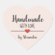 Modern "handmade with love" sticker with a black font on a blush pink background embellished by a cute red heart. Customize text.