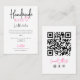 This cute and homey design is perfect for your at-home business. It features the slogan, "Handmade with love," a cute hand-drawn heart, a thank you message, and contact information with a QR code on the back for your customers to scan in order to connect with your website. It includes handwritten typography and a simple black, neon pink, and white colour scheme.