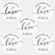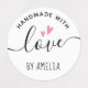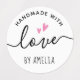 Clothing labels featuring the text "handmade with love" and your custom name on a white or custom colour background. The word "love" is written in an elegant calligraphy script font.